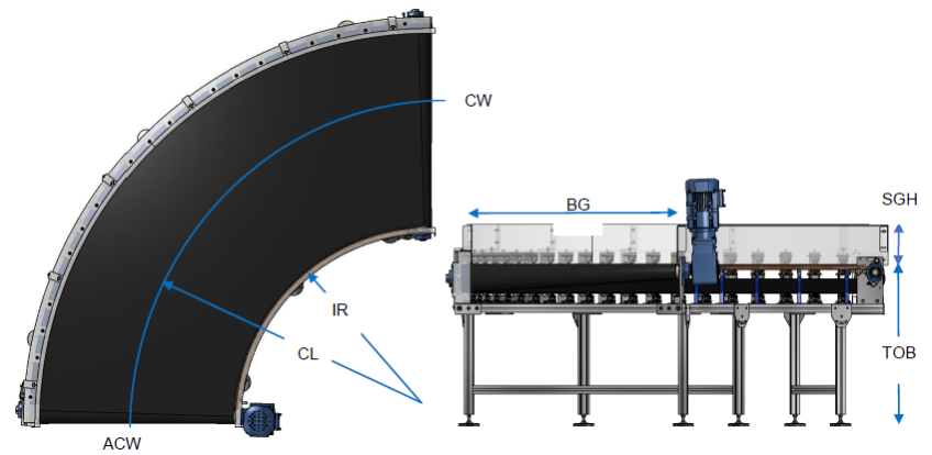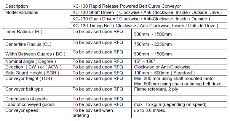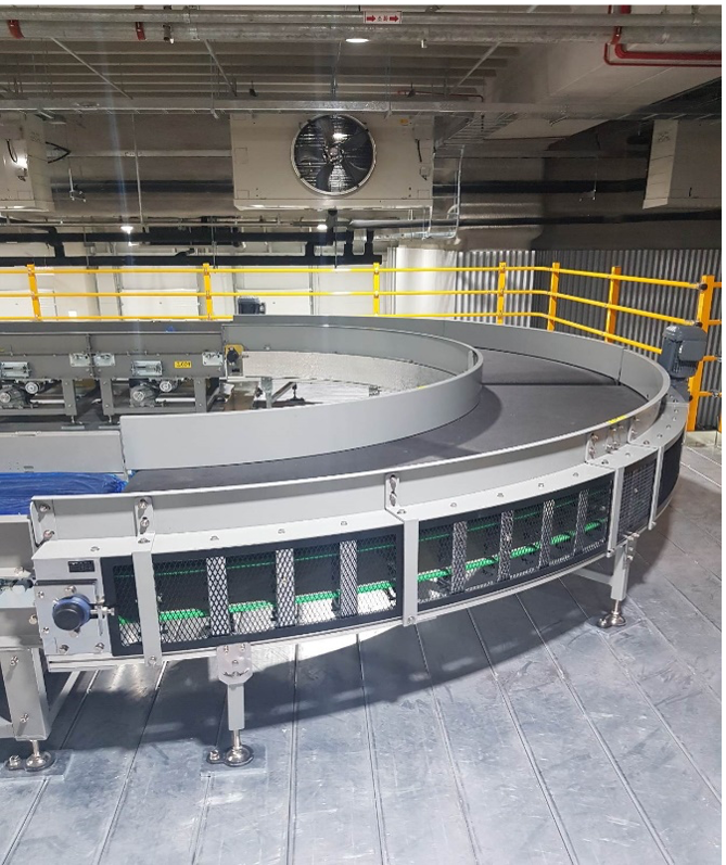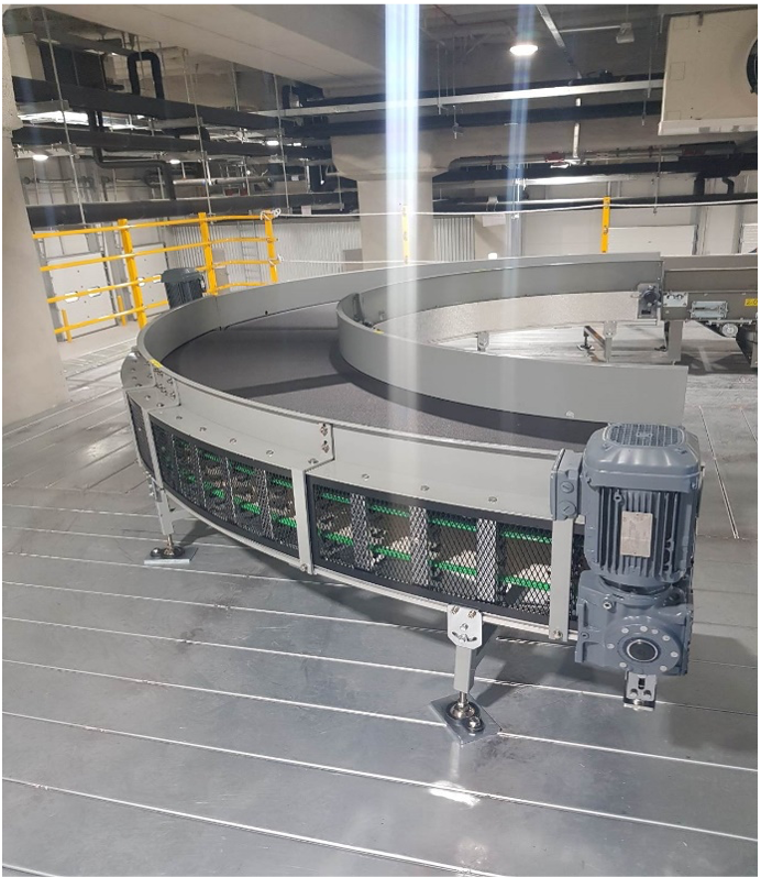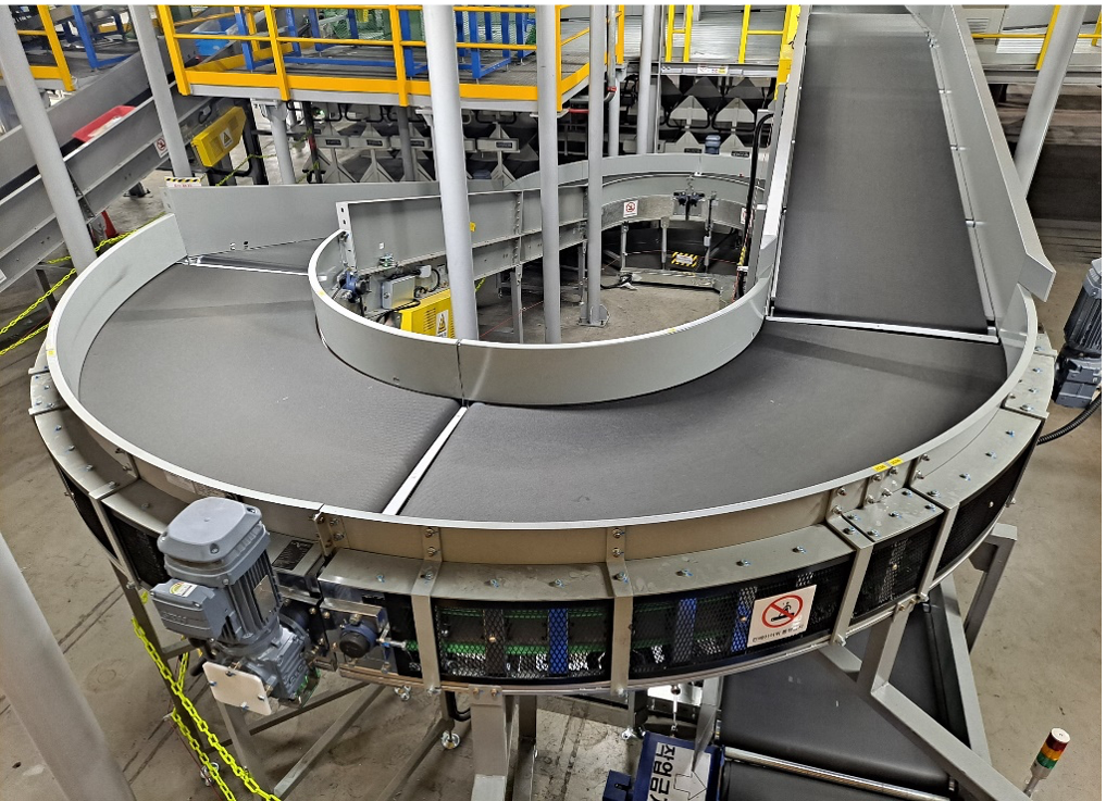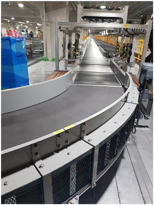 Curve belt conveyor는 물류자동화 설비 중 30°,45°,60°,90°의 방향 전환용으로 사용하는 설비로서 Drive roller conveyor로도 제품의 안정적인 이송이나, 고속으로 이송할 때, 또는 제품을 인식하여 수량 카운트가 필요할 때 반드시 필요한 제품 입니다.